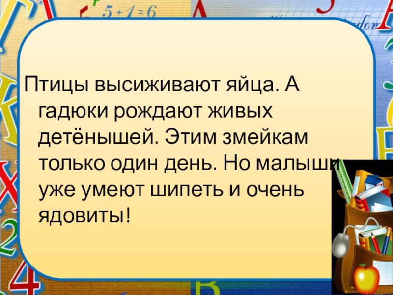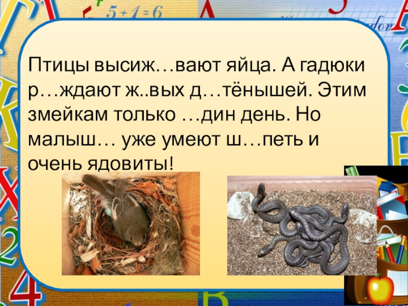 Слайд 9Птицы высиж…вают яйца. А гадюки р…ждают ж..вых д…тёнышей. Этим змейкам только