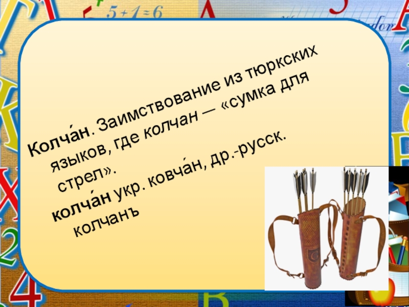 Слайд 14Колча́н. Заимствование из тюркских языков, где колчан — «сумка для стрел».