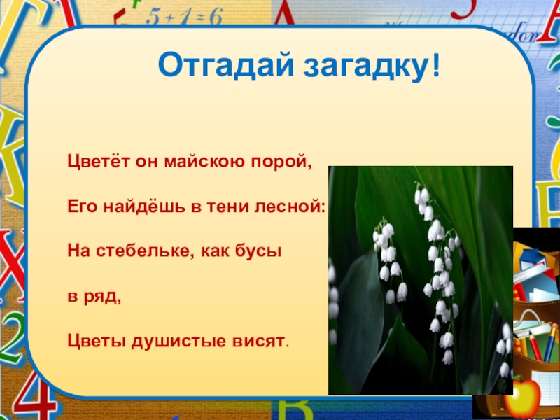 Отгадай загадку!Цветёт он майскою порой,  Его найдёшь в тени лесной:  На стебельке, как бусы в ряд,  Цветы душистые висят.