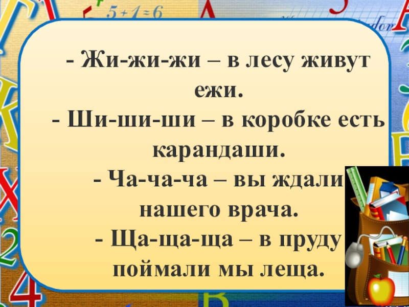 - Жи-жи-жи – в лесу живут ежи. - Ши-ши-ши – в коробке есть карандаши. - Ча-ча-ча –
