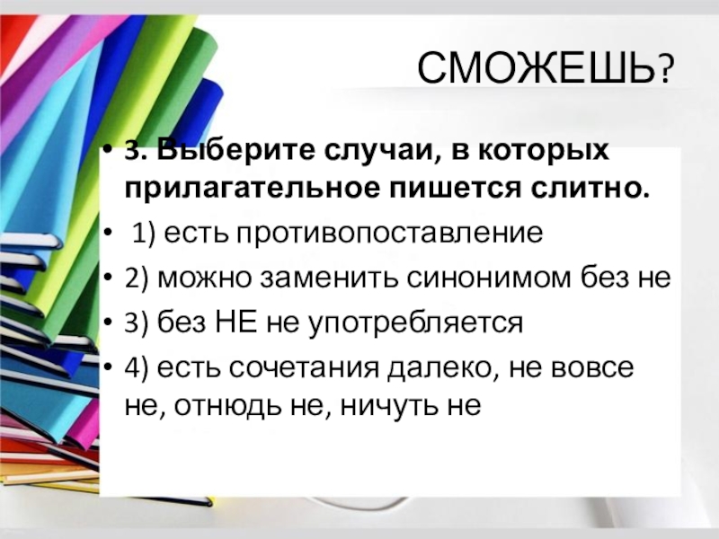 СМОЖЕШЬ?3. Выберите случаи, в которых прилагательное пишется слитно. 1) есть противопоставление2) можно заменить синонимом без не3) без НЕ