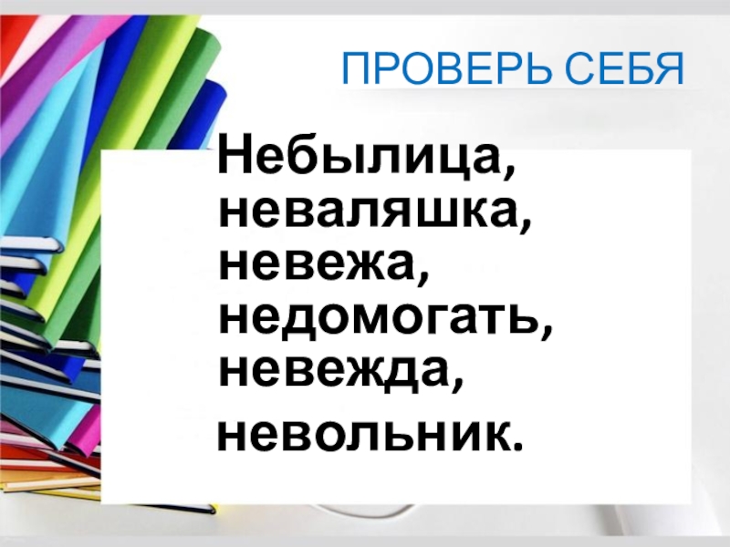 ПРОВЕРЬ СЕБЯ Небылица,  неваляшка,   невежа,       недомогать, невежда, невольник.