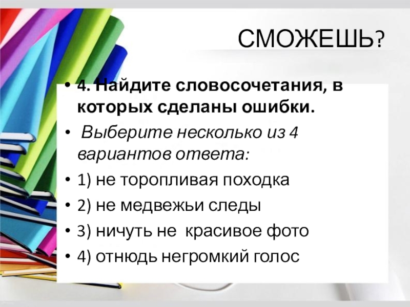 СМОЖЕШЬ?4. Найдите словосочетания, в которых сделаны ошибки. Выберите несколько из 4 вариантов ответа:1) не торопливая походка2) не медвежьи