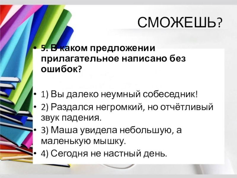 СМОЖЕШЬ?5. В каком предложении прилагательное написано без ошибок?1) Вы далеко неумный собеседник!2) Раздался негромкий, но отчётливый звук