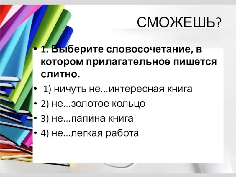 СМОЖЕШЬ?1. Выберите словосочетание, в котором прилагательное пишется слитно. 1) ничуть не...интересная книга2) не...золотое кольцо3) не...папина