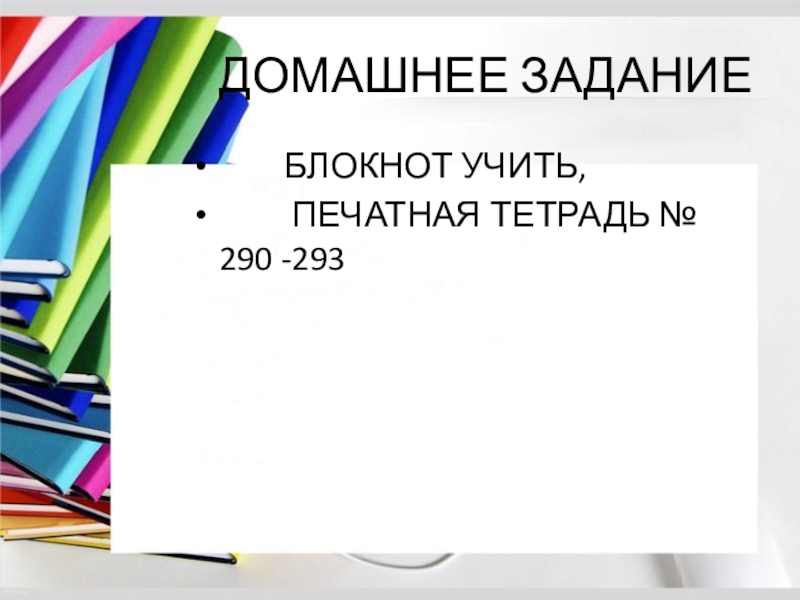 ДОМАШНЕЕ ЗАДАНИЕ    БЛОКНОТ УЧИТЬ,     ПЕЧАТНАЯ ТЕТРАДЬ № 290 -293