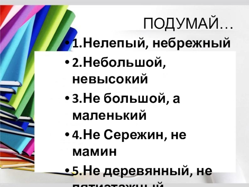 ПОДУМАЙ…1.Нелепый, небрежный2.Небольшой, невысокий3.Не большой, а маленький4.Не Сережин, не мамин5.Не деревянный, не пятиэтажный6.не выше, не умнее
