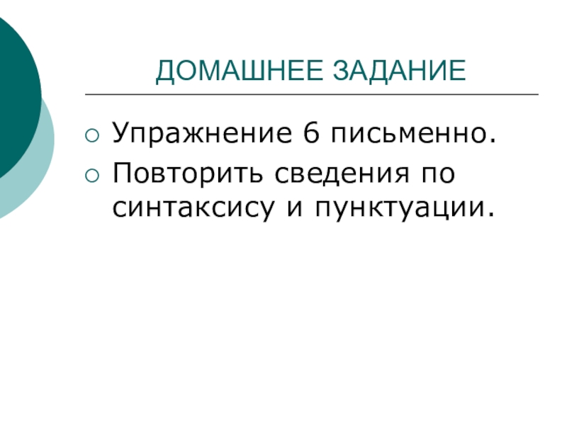 ДОМАШНЕЕ ЗАДАНИЕУпражнение 6 письменно.Повторить сведения по синтаксису и пунктуации.