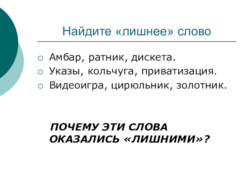 Найдите «лишнее» словоАмбар, ратник, дискета.Указы, кольчуга, приватизация.Видеоигра, цирюльник, золотник.  ПОЧЕМУ ЭТИ СЛОВА ОКАЗАЛИСЬ «ЛИШНИМИ»?