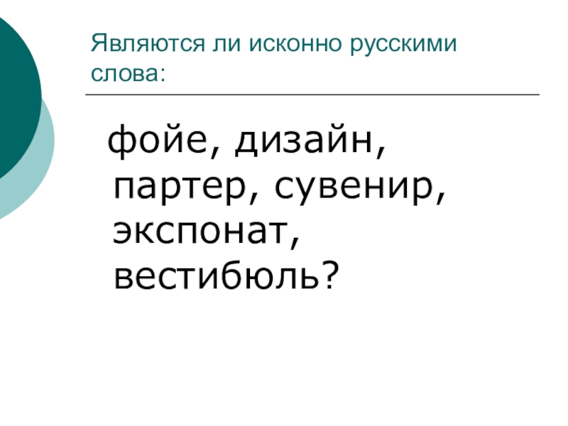 Являются ли исконно русскими слова: фойе, дизайн, партер, сувенир, экспонат, вестибюль?