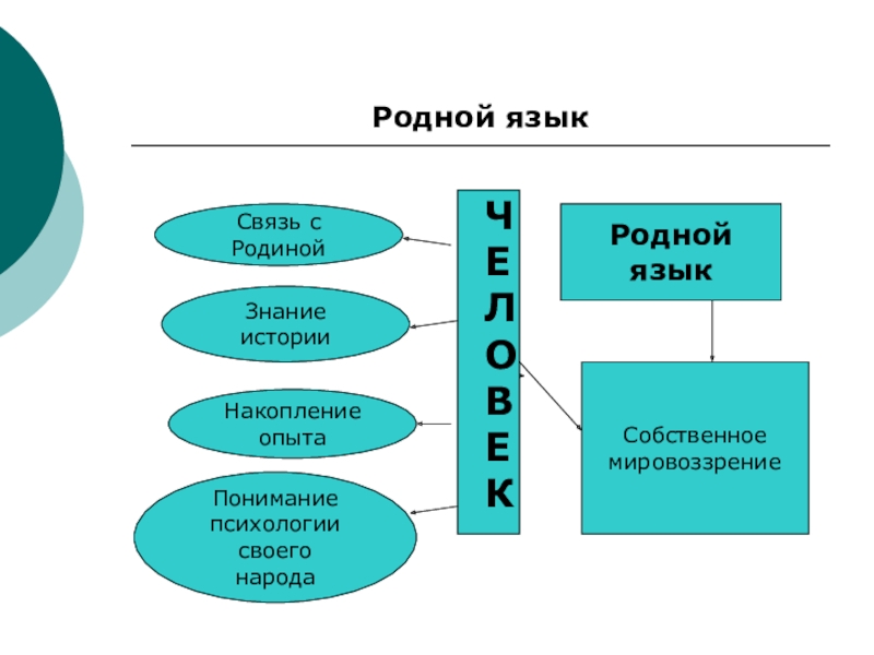 Родной языкРодной языкСобственноемировоззрениеСвязь с РодинойЗнание историиНакопление опытаПонимание психологии своего народаЧЕ Л О В Е К