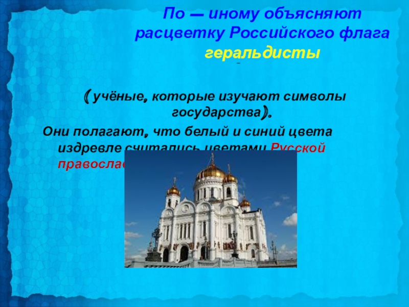 Слайд 14По – иному объясняют расцветку Российского флага геральдисты