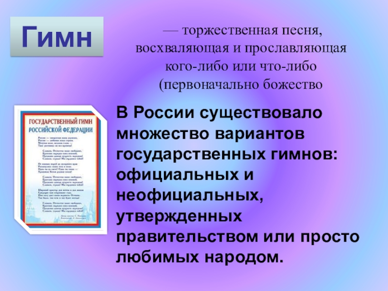 Слайд 37В России существовало множество вариантов государственных гимнов: официальных и неофициальных, утвержденных