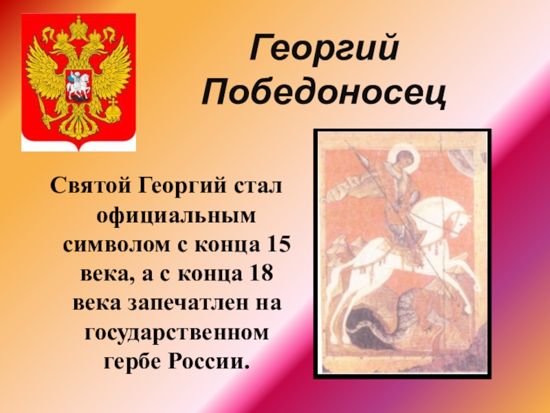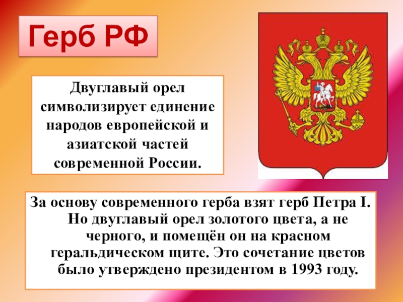 Слайд 33Двуглавый орел символизирует единение народов европейской и азиатской частей современной России.