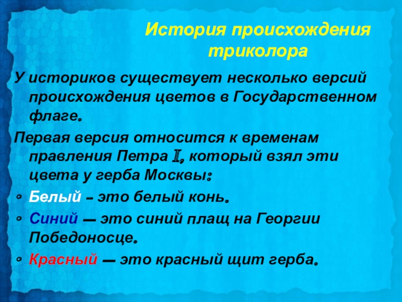 Первая версия относится к временам правления Петра I, который взял эти цвета у герба Москвы: