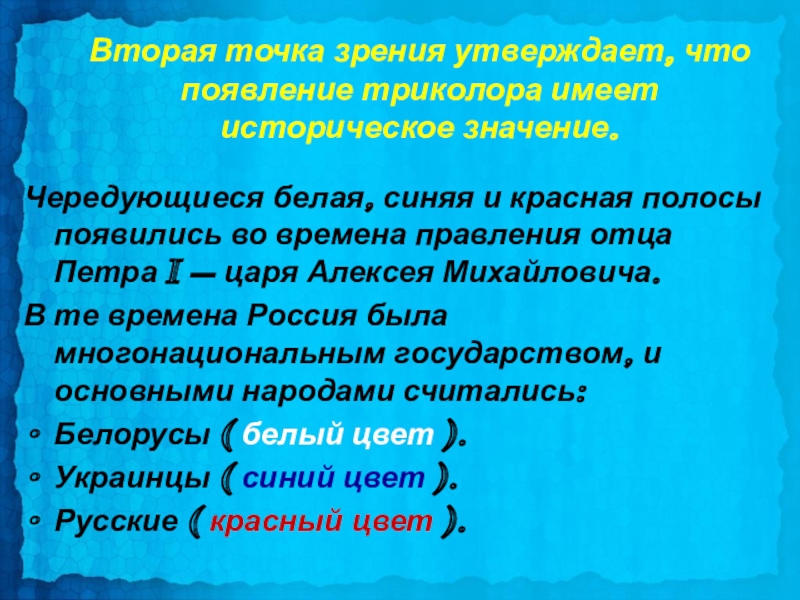 Слайд 12Вторая точка зрения утверждает, что появление триколора имеет историческое значение.