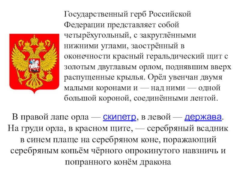 Слайд 27Государственный герб Российской Федерации представляет собой четырёхугольный, с закруглёнными нижними углами,