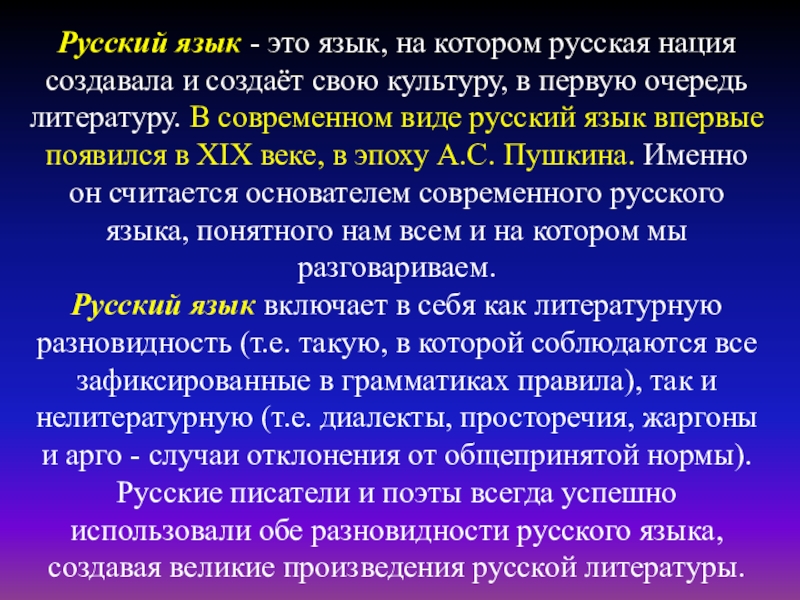 создаёт свою культуру, в первую очередь литературу. В современном виде русский язык впервые появился в XIX веке, в эпоху А.С. Пушкина. Именно он считается основателем современного русского языка, понятного нам всем и на котором мы разговариваем.