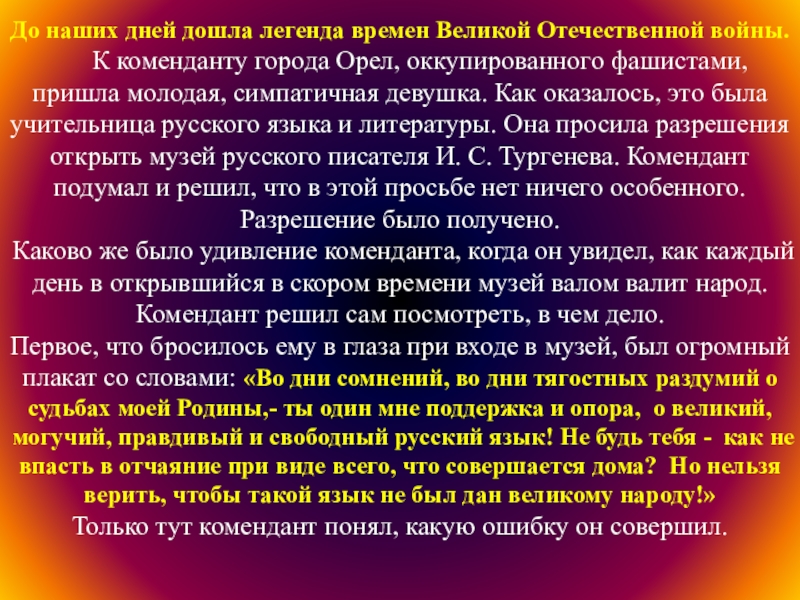 города Орел, оккупированного фашистами, пришла молодая, симпатичная девушка. Как оказалось, это была учительница русского языка и литературы. Она просила разрешения открыть музей русского писателя И. С. Тургенева. Комендант подумал и решил, что в этой просьбе нет ничего особенного. Разрешение было получено.