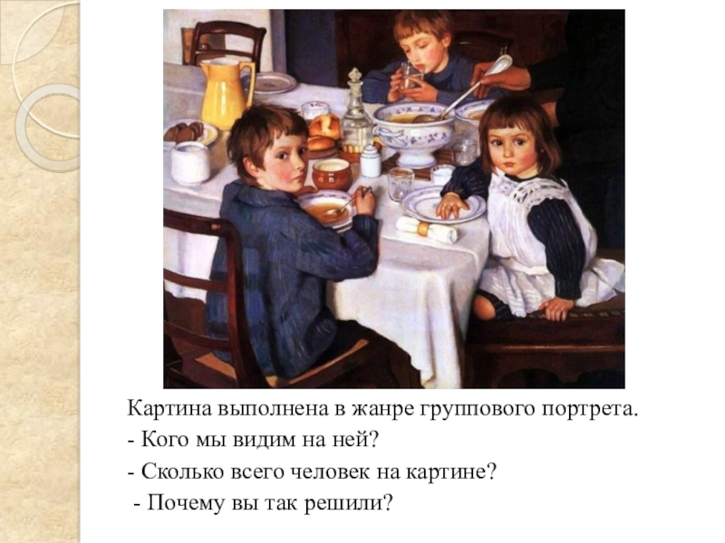 Картина выполнена в жанре группового портрета. - Кого мы видим на ней? - Сколько всего человек на
