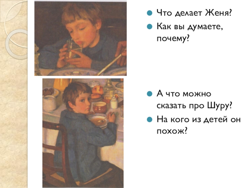 Что делает Женя?Как вы думаете, почему?А что можно сказать про Шуру?На кого из детей он похож?