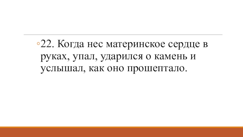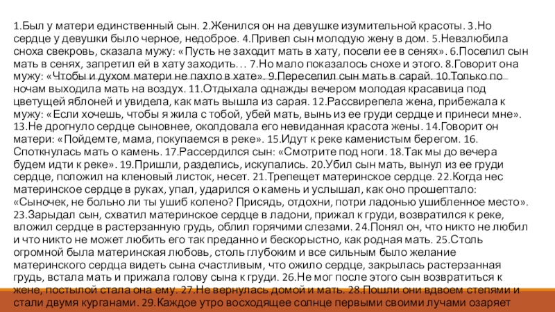 3.Но сердце у девушки было черное, недоброе. 4.Привел сын молодую жену в дом. 5.Невзлюбила сноха свекровь, сказала мужу: «Пусть не заходит мать в хату, посели ее в сенях». 6.Поселил сын мать в сенях, запретил ей в хату заходить… 7.Но мало показалось снохе и этого. 8.Говорит она мужу: «Чтобы и духом матери не пахло в хате». 9.Переселил сын мать в сарай. 10.Только по ночам выходила мать на воздух. 11.Отдыхала однажды вечером молодая красавица под цветущей яблоней и увидела, как мать вышла из сарая. 12.Рассвирепела жена, прибежала к мужу: «Если хочешь, чтобы я жила с тобой, убей мать, вынь из ее груди сердце и принеси мне». 13.Не дрогнуло сердце сыновнее, околдовала его невиданная красота жены. 14.Говорит он матери: «Пойдемте, мама, покупаемся в реке». 15.Идут к реке каменистым берегом. 16.Споткнулась мать о камень. 17.Рассердился сын: «Смотрите под ноги. 18.Так мы до вечера будем идти к реке». 19.Пришли, разделись, искупались. 20.Убил сын мать, вынул из ее груди сердце, положил на кленовый листок, несет. 21.Трепещет материнское сердце. 22.Когда нес материнское сердце в руках, упал, ударился о камень и услышал, как оно прошептало: «Сыночек, не больно ли ты ушиб колено? Присядь, отдохни, потри ладонью ушибленное место». 23.Зарыдал сын, схватил материнское сердце в ладони, прижал к груди, возвратился к реке, вложил сердце в растерзанную грудь, облил горячими слезами. 24.Понял он, что никто не любил и что никто не может любить его так преданно и бескорыстно, как родная мать. 25.Столь огромной была материнская любовь, столь глубоким и все сильным было желание материнского сердца видеть сына счастливым, что ожило сердце, закрылась растерзанная грудь, встала мать и прижала голову сына к груди. 26.Не мог после этого сын возвратиться к жене, постылой стала она ему. 27.Не вернулась домой и мать. 28.Пошли они вдвоем степями и стали двумя курганами. 29.Каждое утро восходящее солнце первыми своими лучами озаряет вершины курганов…