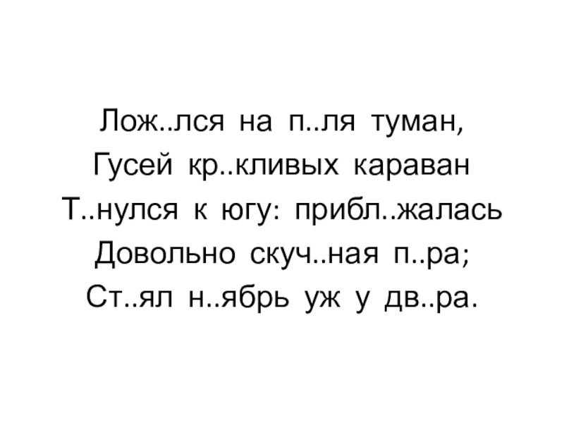 Лож..лся на п..ля туман,Гусей кр..кливых караванТ..нулся к югу: прибл..жаласьДовольно скуч..ная п..ра;Ст..ял н..ябрь уж у дв..ра.