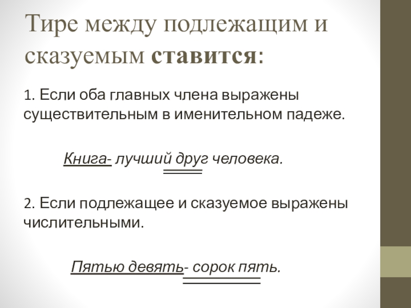 Тире между подлежащим и сказуемым ставится:1. Если оба главных члена выражены существительным в именительном падеже. Книга- лучший друг человека.2. Если подлежащее и сказуемое выражены числительными.