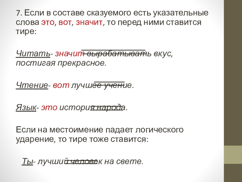7. Если в составе сказуемого есть указательные слова это, вот, значит, то перед ними ставится тире:Читать- значит
