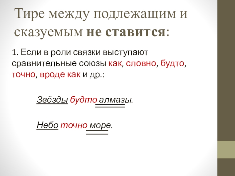 Тире между подлежащим и сказуемым не ставится:1. Если в роли связки выступают сравнительные союзы как, словно, будто,