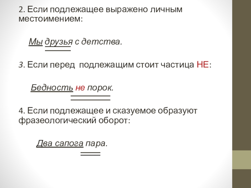 2. Если подлежащее выражено личным местоимением:   Мы друзья с детства.3. Если перед подлежащим стоит частица