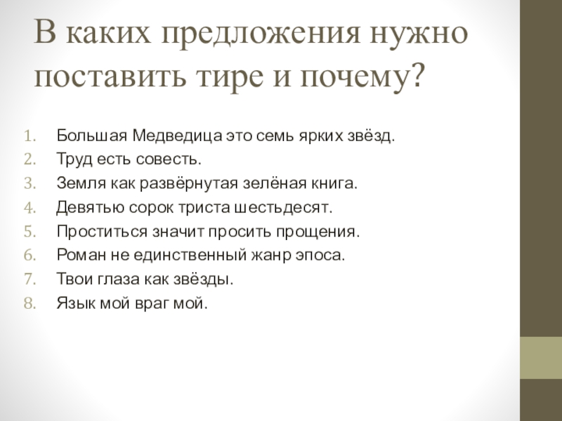 Слайд 9В каких предложения нужно поставить тире и почему?