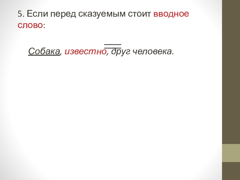 5. Если перед сказуемым стоит вводное слово:   Собака, известно, друг человека.