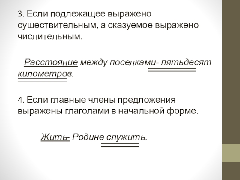 3. Если подлежащее выражено существительным, а сказуемое выражено числительным.  Расстояние между поселками- пятьдесят
