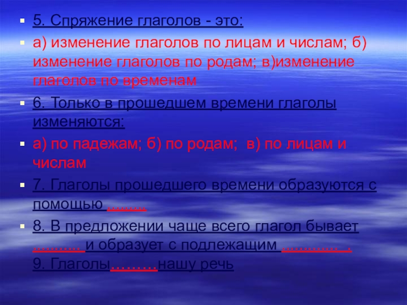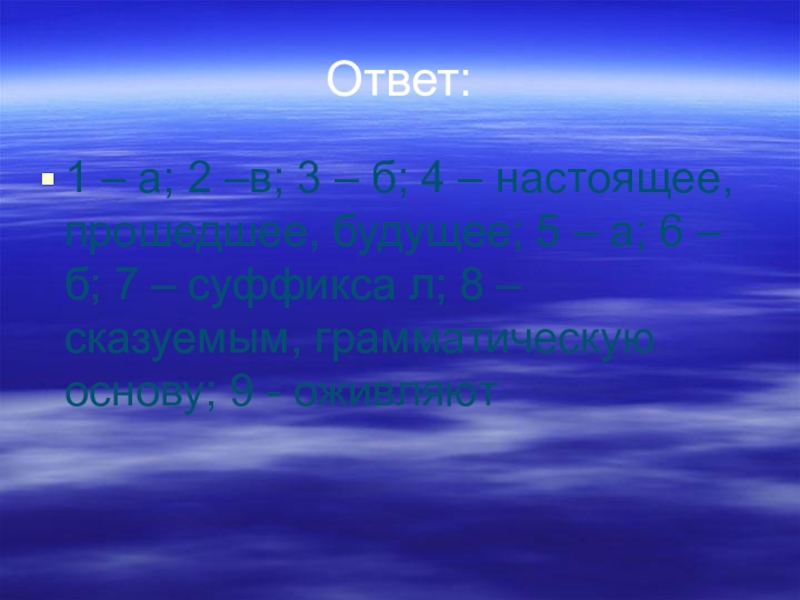 прошедшее, будущее; 5 – а; 6 – б; 7 – суффикса л; 8 – сказуемым, грамматическую основу; 9 - оживляют
