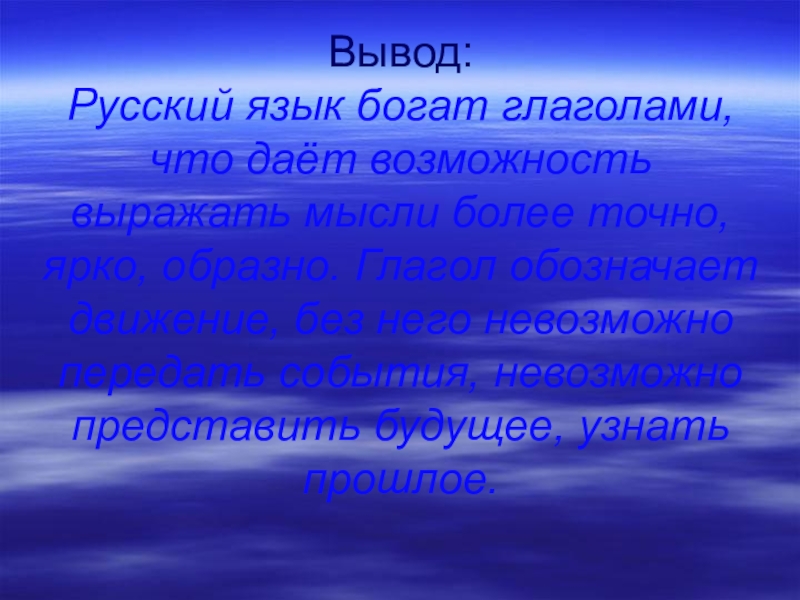 Слайд 16Вывод: Русский язык богат глаголами, что даёт возможность выражать мысли более точно,
