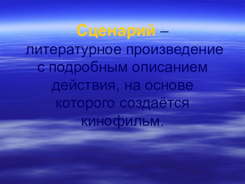 Сценарий –  литературное произведение с подробным описанием действия, на основе которого создаётся кинофильм.