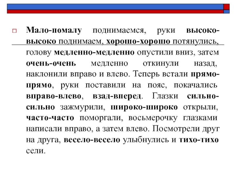 Мало-помалу поднимаемся, руки высоко-высоко поднимаем, хорошо-хорошо потянулись, голову медленно-медленно опустили вниз,