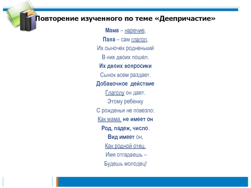 Слайд 3Повторение изученного по теме «Деепричастие»