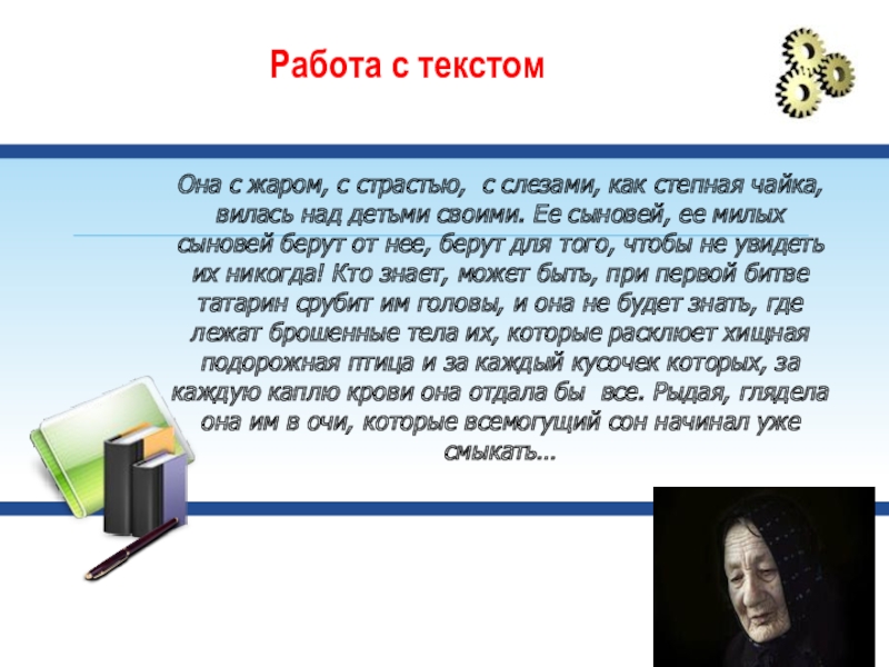 чайка, вилась над детьми своими. Ее сыновей, ее милых сыновей берут от нее, берут для того, чтобы не увидеть их никогда! Кто знает, может быть, при первой битве татарин срубит им головы, и она не будет знать, где лежат брошенные тела их, которые расклюет хищная подорожная птица и за каждый кусочек которых, за каждую каплю крови она отдала бы все. Рыдая, глядела она им в очи, которые всемогущий сон начинал уже смыкать…