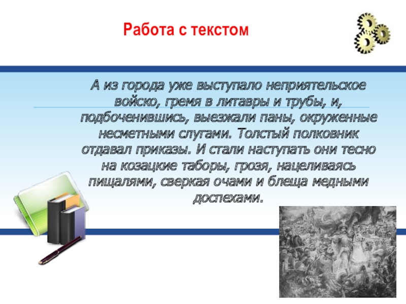 литавры и трубы, и, подбоченившись, выезжали паны, окруженные несметными слугами. Толстый полковник отдавал приказы. И стали наступать они тесно на козацкие таборы, грозя, нацеливаясь пищалями, сверкая очами и блеща медными доспехами.