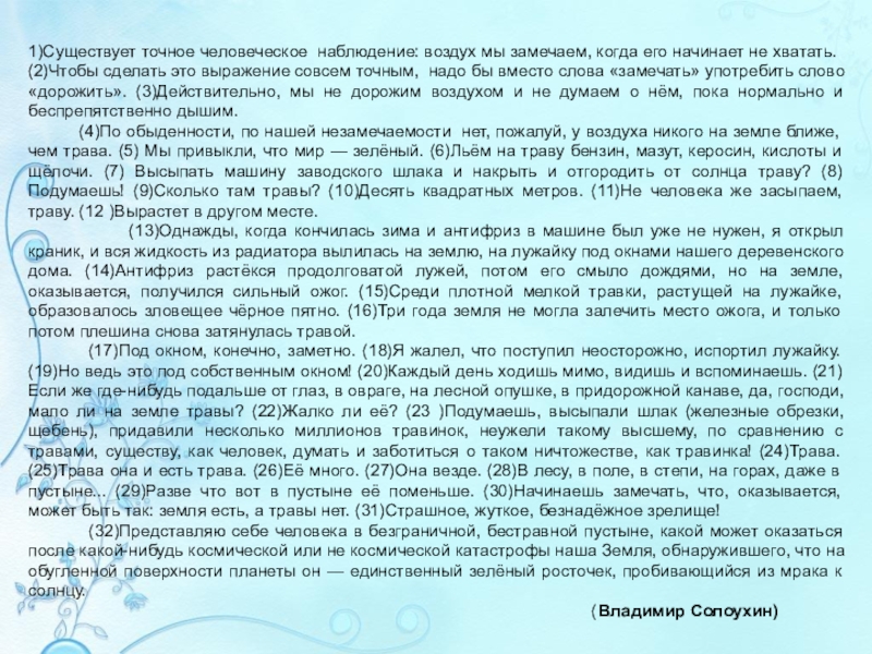 (4)По обыденности, по нашей незамечаемости нет, пожалуй, у воздуха никого на земле ближе, чем трава. (5) Мы привыкли, что мир — зелёный. (6)Льём на траву бензин, мазут, керосин, кислоты и щёлочи. (7) Высыпать машину заводского шлака и накрыть и отгородить от солнца траву? (8)Подумаешь! (9)Сколько там травы? (10)Десять квадратных метров. (11)Не человека же засыпаем, траву. (12 )Вырастет в другом месте.