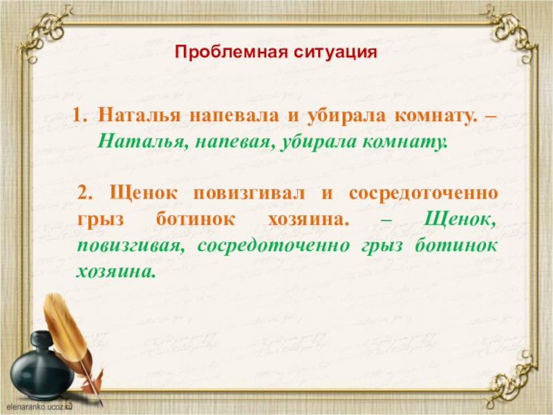 2. Щенок повизгивал и сосредоточенно грыз ботинок хозяина. – Щенок, повизгивая, сосредоточенно грыз ботинок хозяина.