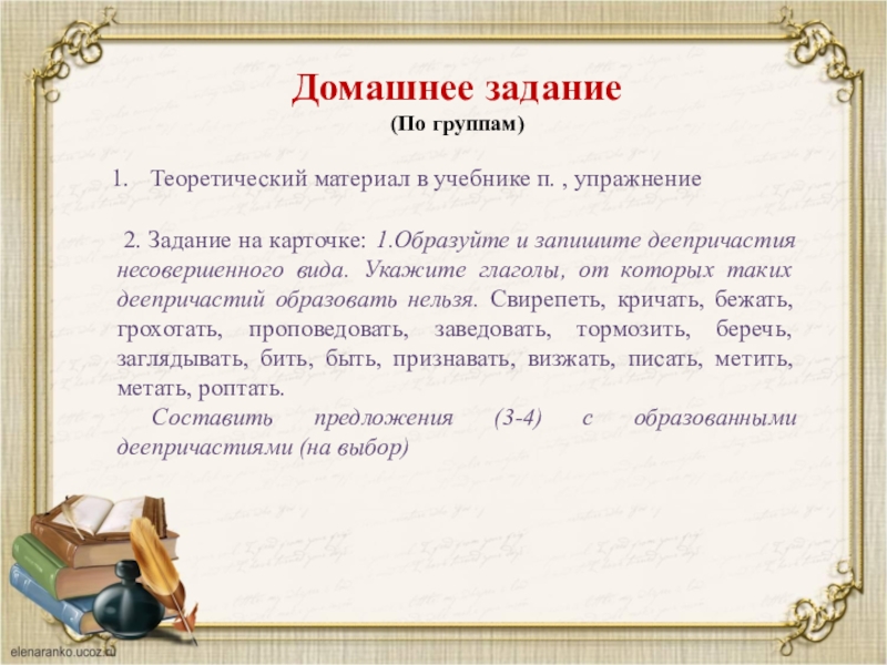 2. Задание на карточке: 1.Образуйте и запишите деепричастия несовершенного вида. Укажите глаголы, от которых таких деепричастий образовать нельзя. Свирепеть, кричать, бежать, грохотать, проповедовать, заведовать, тормозить, беречь, заглядывать, бить, быть, признавать, визжать, писать, метить, метать, роптать.