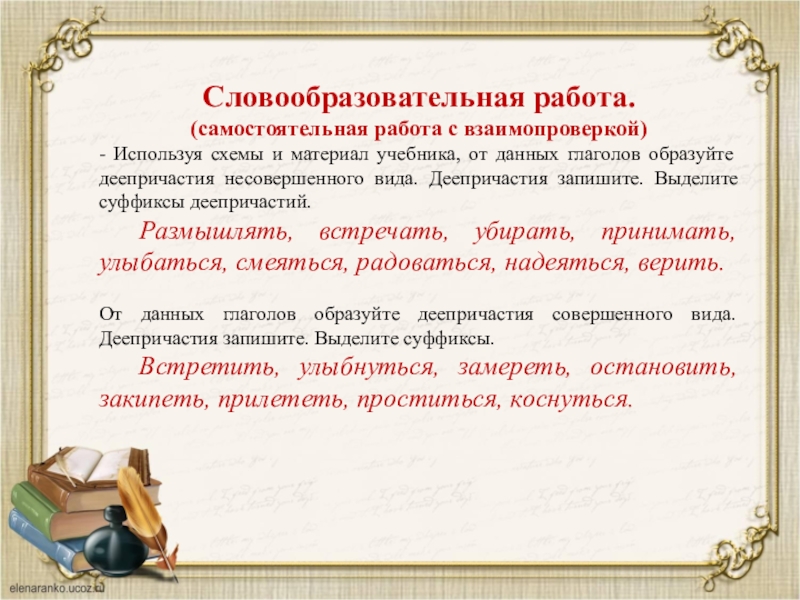 учебника, от данных глаголов образуйте деепричастия несовершенного вида. Деепричастия запишите. Выделите суффиксы деепричастий.