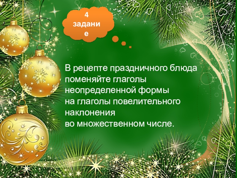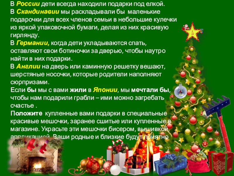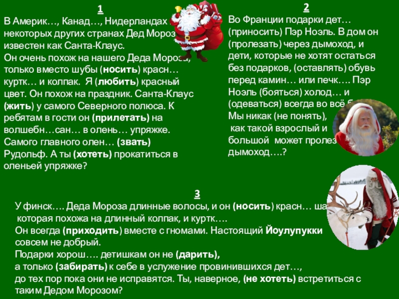 Во Франции подарки дет… (приносить) Пэр Ноэль. В дом он (пролезать) через дымоход, и дети, которые не хотят остаться без подарков, (оставлять) обувь перед камин… или печк…. Пэр Ноэль (бояться) холод… и (одеваться) всегда во всё белое.