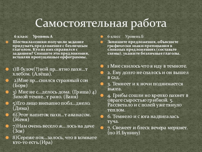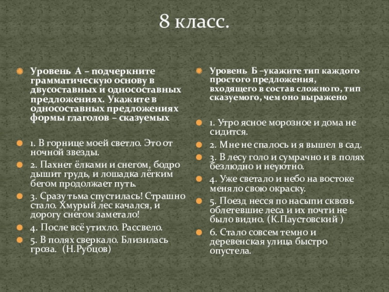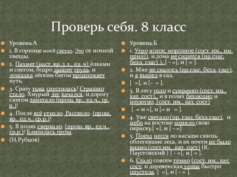 Уровень Б –укажите тип каждого простого предложения, входящего в состав сложного, тип сказуемого, чем оно выражено