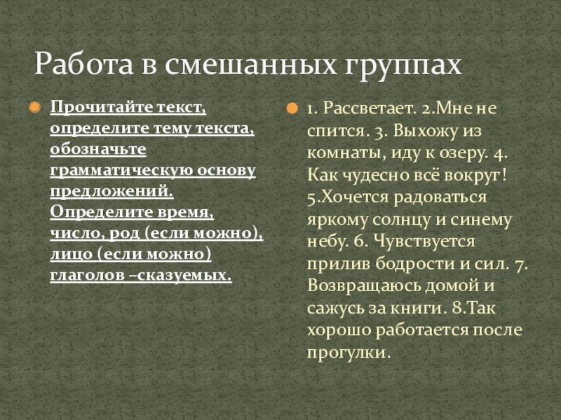 1. Рассветает. 2.Мне не спится. 3. Выхожу из комнаты, иду к озеру. 4.Как чудесно всё вокруг! 5.Хочется радоваться яркому солнцу и синему небу. 6. Чувствуется прилив бодрости и сил. 7.Возвращаюсь домой и сажусь за книги. 8.Так хорошо работается после прогулки.