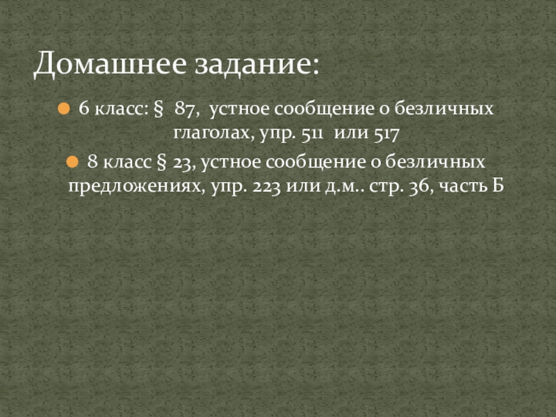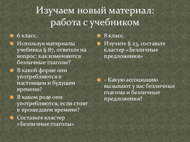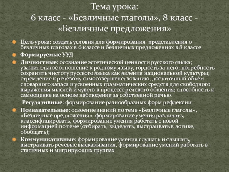 6 класс - «Безличные глаголы», 8 класс - «Безличные предложения»