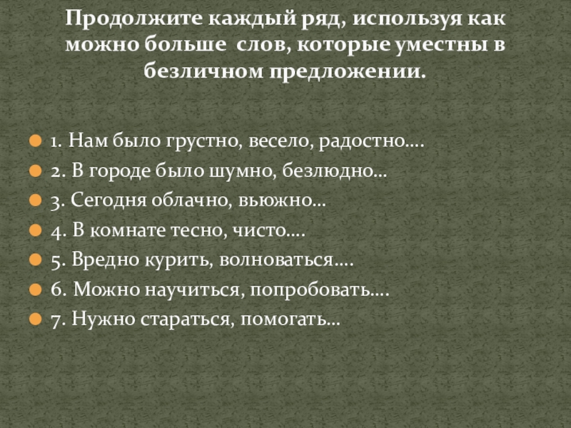 Продолжите каждый ряд, используя как можно больше слов, которые уместны в безличном предложении.
